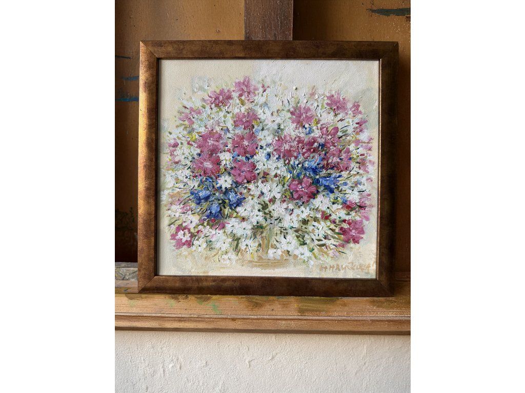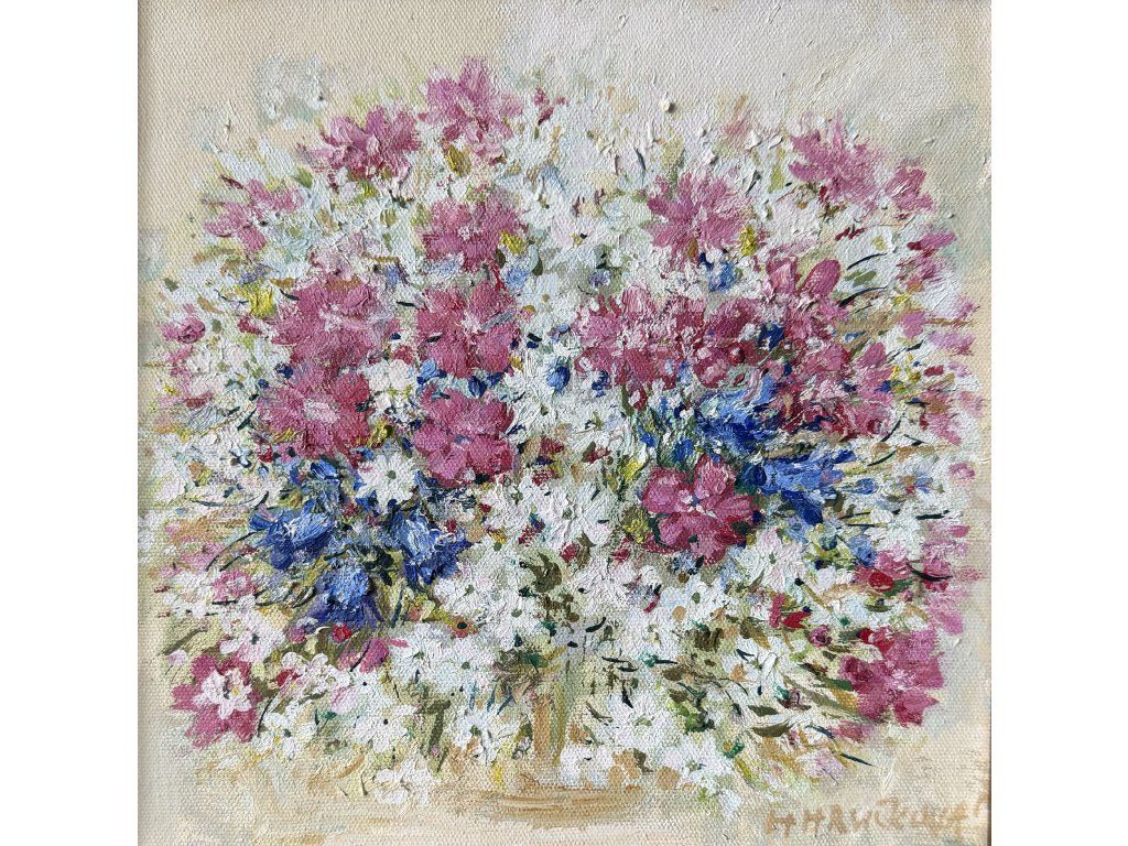 Technika: olejomalba na plátně Rozměr: 25 × 25 cm Autor: Helena Hrušková Štefková, akademická malířka Stav: originál, podepsáno autorkou, certifikát pravosti přiložen Rám: volitelně bílý nebo zlatý (+500 Kč)
