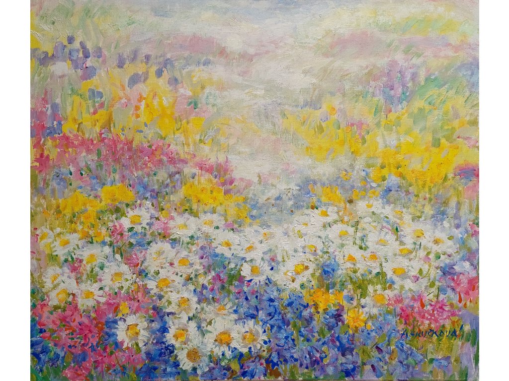 BArevná louka s kopretinami, zvonky a dalším lučním kvítím