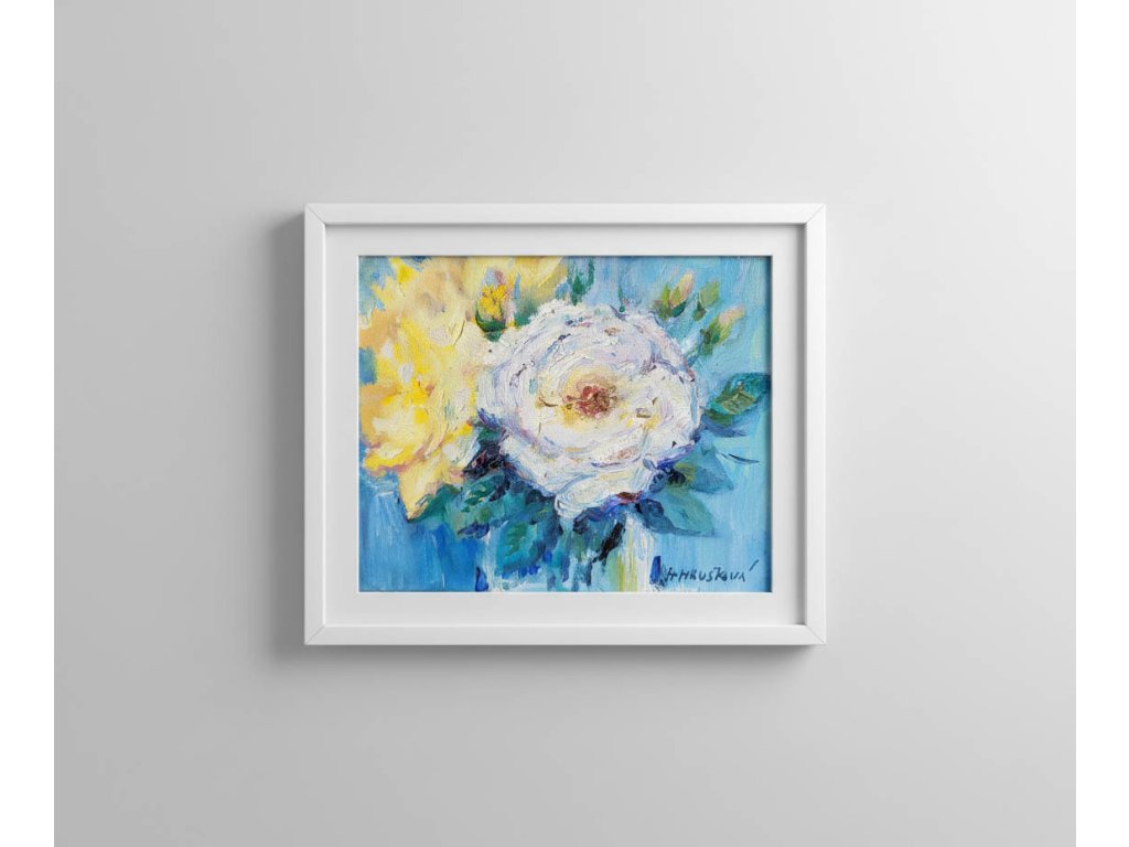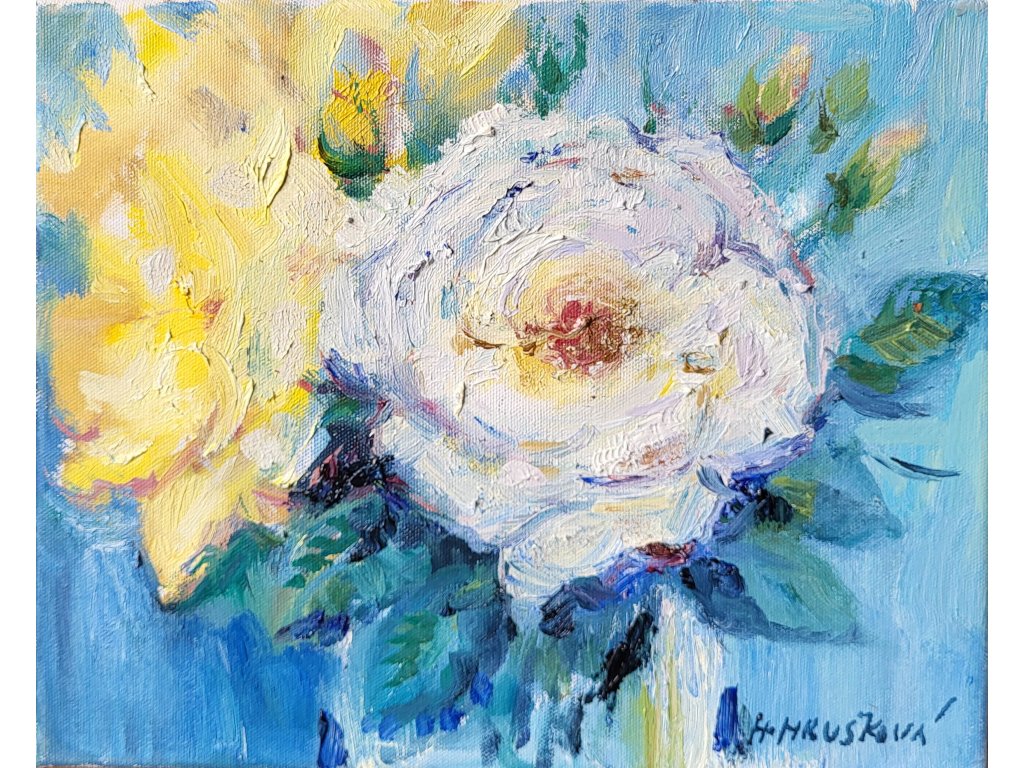Bílá růže na modrém pozadíImpresionisticky laděná malba olejem na plátně25x30cm