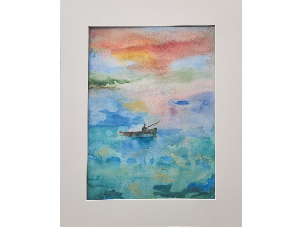 Akvarel rybáře na moři při západu slunce